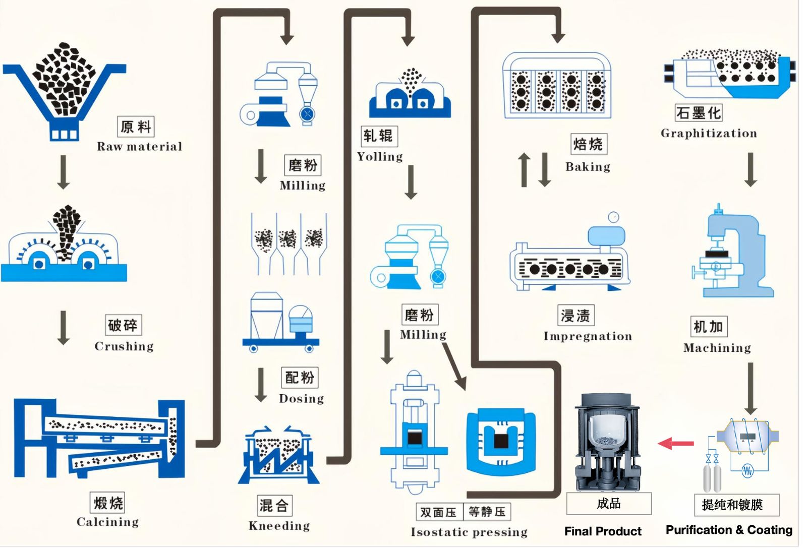 The demand from the industry over the years has been for special graphite and carbon with increasingly tighter and stable properties. The special graphite is also called as isotropic graphite and isostatic graphite. The special carbon is mainly carbon-carbon composite material which is reinforced by high strength carbon fiber. The special graphite and carbon are waidely used in the fields such as semi-conductor, mold, electronics, photovoltaic, automobiles and other means of transport.